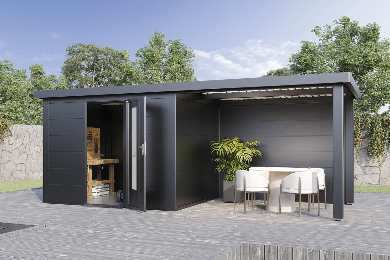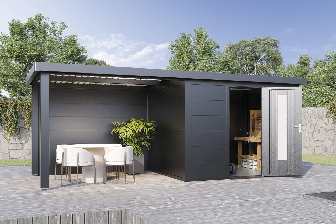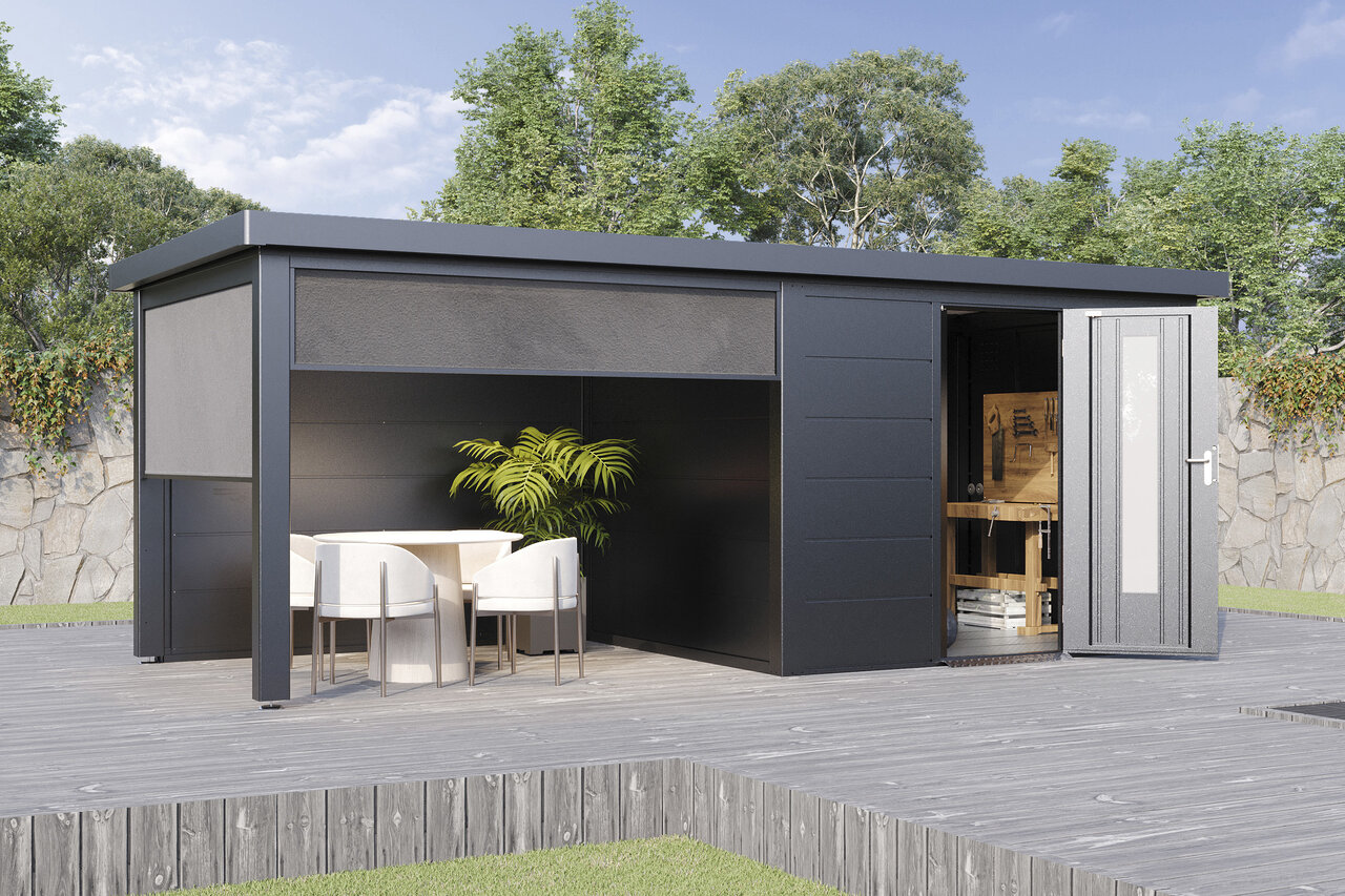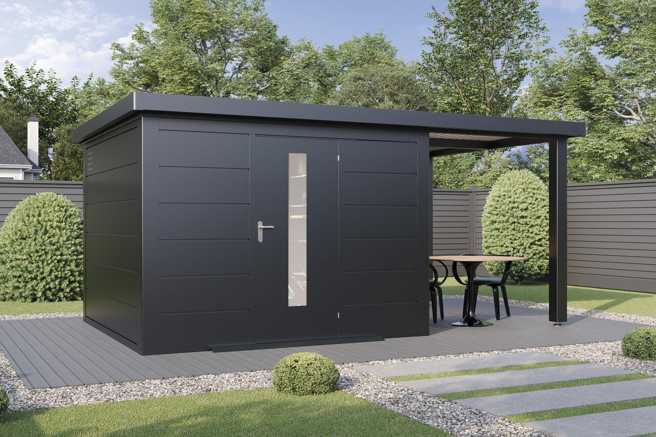 Premium-Metall-Gartenhaus mit Seitendach – stark, elegant, flexibel Das Premium-Metall-Gerätehaus mit Seitendach kombiniert modernes Design mit beeindruckender Funktionalität. Aus korrosionsbeständigem Stahlblech gefertigt, bietet es eine Dachlast von 150 kg/m², Windbeständigkeit bis Stärke 12 und 25 Jahre Garantie gegen Durchrostung. Ein integriertes Dachentwässerungssystem mit Fallrohren schützt vor Regenwasser, während Anti-Tropf-Vlies unter dem Dach Kondenswasserbildung verhindert. Mit hochwertigem Zubehör und der Wahl zwischen Einzel- oder Doppeltüren mit Lichtelementen sowie zusätzlichen Seitenwänden wird das Metall-Gartenhaus mit Seitendach zum flexiblen, stilvollen Hingucker in Ihrem Garten – stabil, zeitlos und ganz nach Ihren Wünschen. Eleganz und Funktion für höchste Ansprüche – Ihr Garten verdient das Beste.