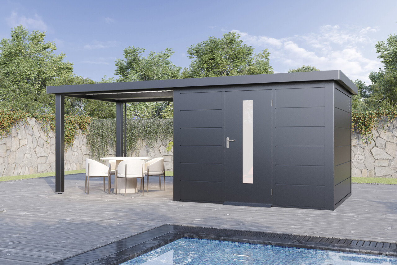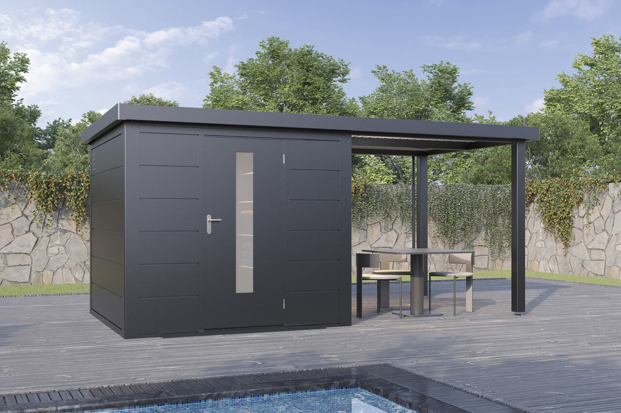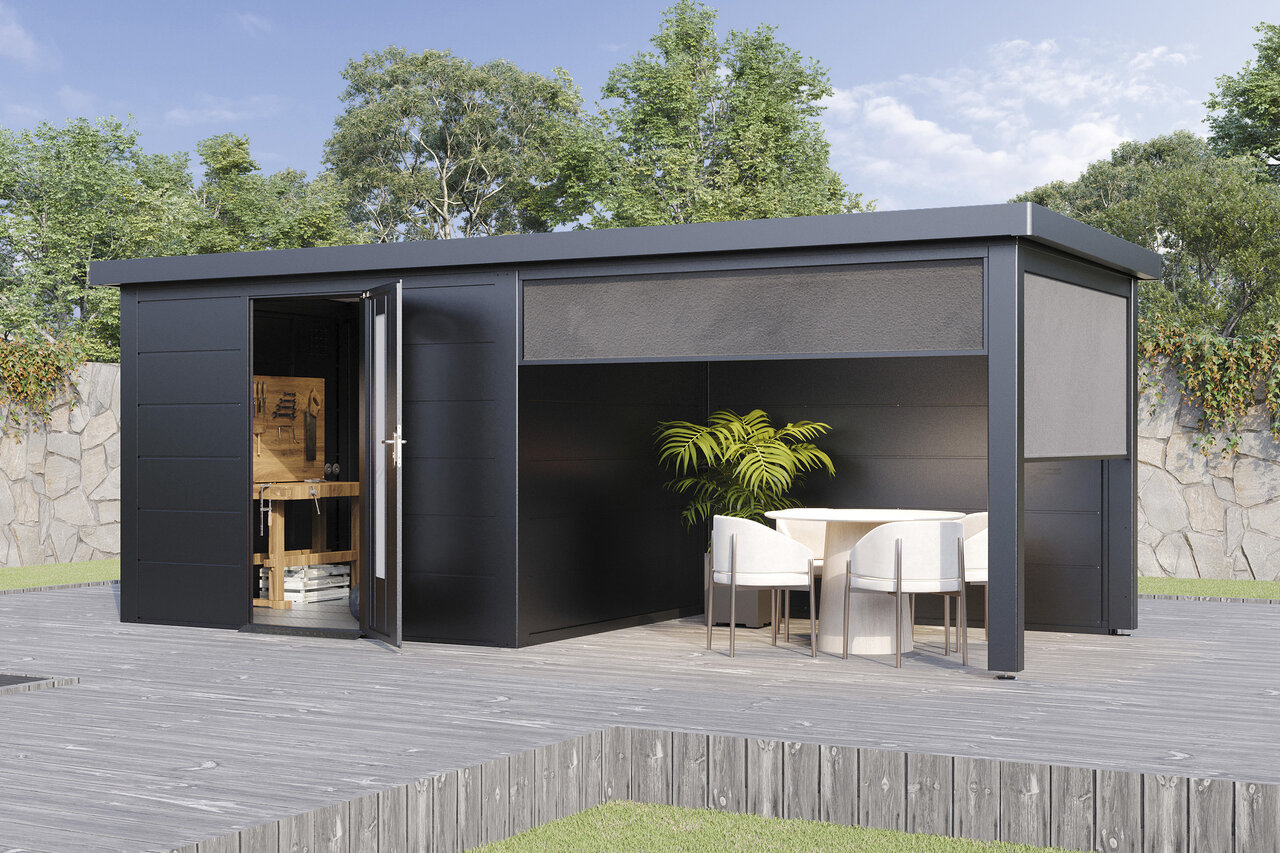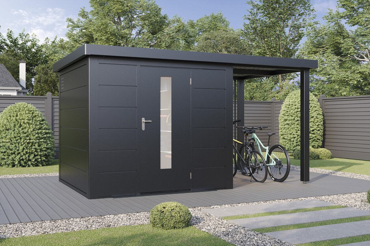 Premium-Metall-Gartenhaus mit Seitendach – stark, elegant, flexibel Das Premium-Metall-Gerätehaus mit Seitendach kombiniert modernes Design mit beeindruckender Funktionalität. Aus korrosionsbeständigem Stahlblech gefertigt, bietet es eine Dachlast von 150 kg/m², Windbeständigkeit bis Stärke 12 und 25 Jahre Garantie gegen Durchrostung. Ein integriertes Dachentwässerungssystem mit Fallrohren schützt vor Regenwasser, während Anti-Tropf-Vlies unter dem Dach Kondenswasserbildung verhindert. Mit hochwertigem Zubehör und der Wahl zwischen Einzel- oder Doppeltüren mit Lichtelementen sowie zusätzlichen Seitenwänden wird das Metall-Gartenhaus mit Seitendach zum flexiblen, stilvollen Hingucker in Ihrem Garten – stabil, zeitlos und ganz nach Ihren Wünschen. Eleganz und Funktion für höchste Ansprüche – Ihr Garten verdient das Beste.
