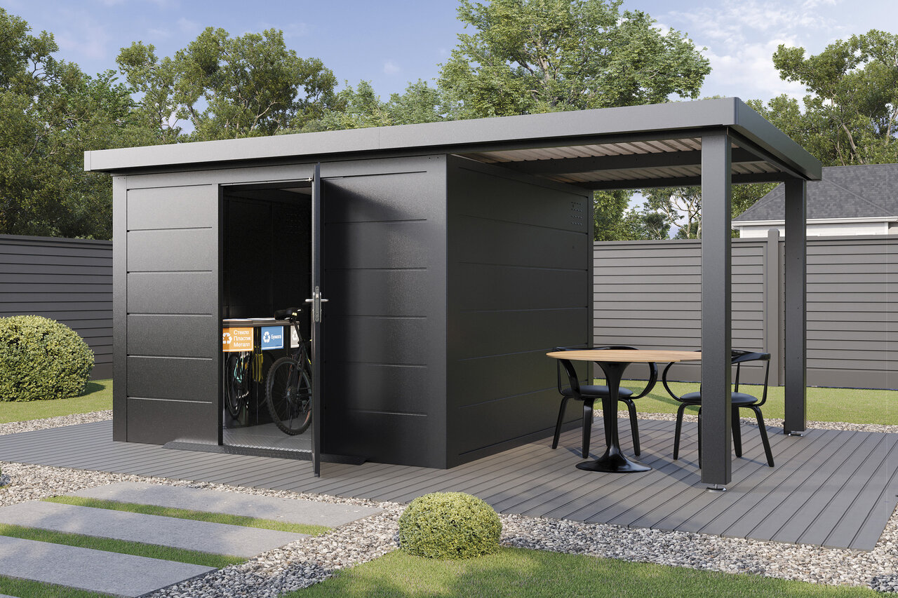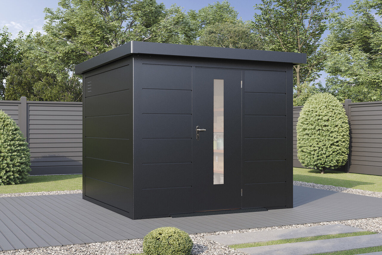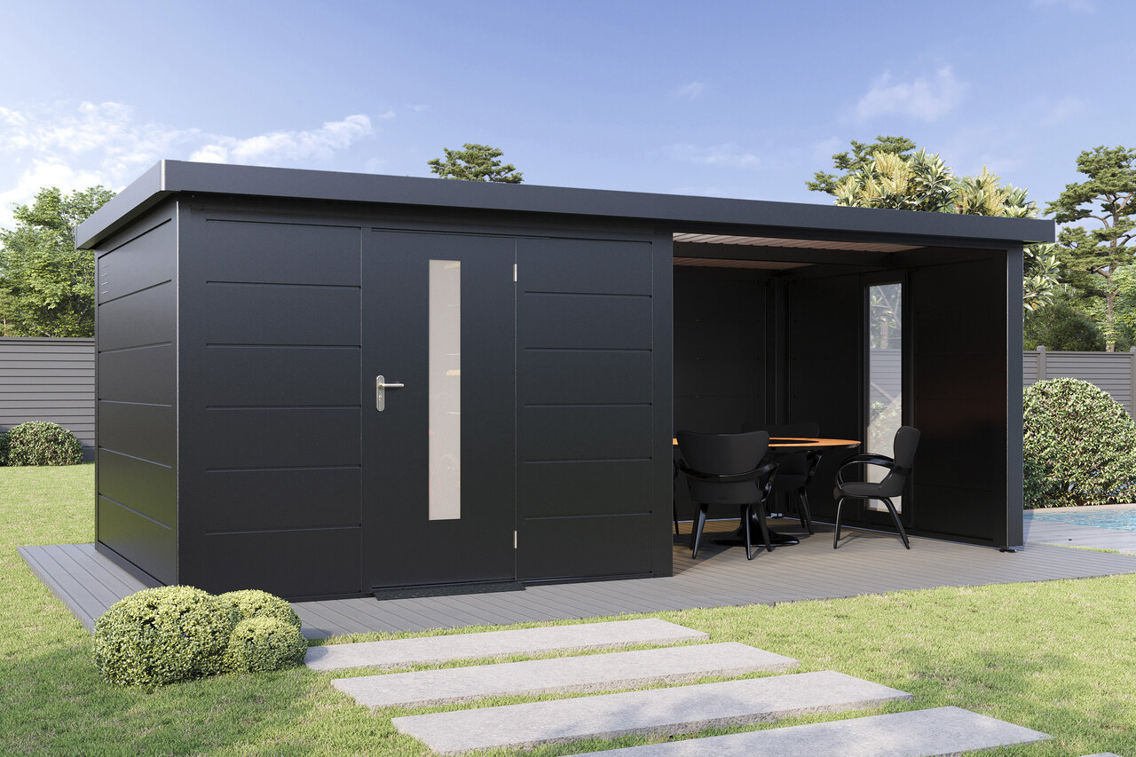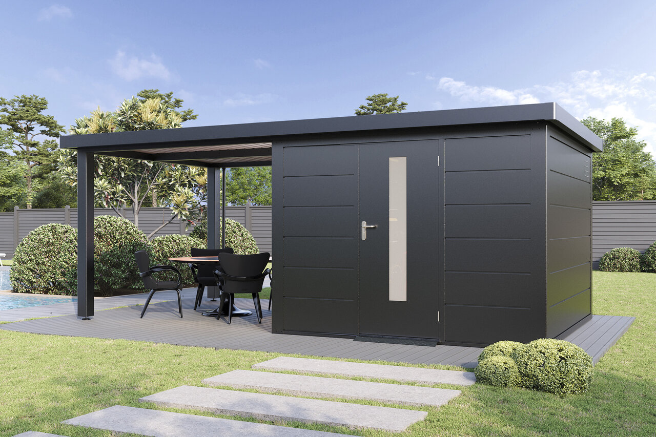Premium-Metall-Gartenhaus mit Seitendach – stark, elegant, flexibel Das Premium-Metall-Gerätehaus mit Seitendach kombiniert modernes Design mit beeindruckender Funktionalität. Aus korrosionsbeständigem Stahlblech gefertigt, bietet es eine Dachlast von 150 kg/m², Windbeständigkeit bis Stärke 12 und 25 Jahre Garantie gegen Durchrostung. Ein integriertes Dachentwässerungssystem mit Fallrohren schützt vor Regenwasser, während Anti-Tropf-Vlies unter dem Dach Kondenswasserbildung verhindert. Mit hochwertigem Zubehör und der Wahl zwischen Einzel- oder Doppeltüren mit Lichtelementen sowie zusätzlichen Seitenwänden wird das Metall-Gartenhaus mit Seitendach zum flexiblen, stilvollen Hingucker in Ihrem Garten – stabil, zeitlos und ganz nach Ihren Wünschen. Eleganz und Funktion für höchste Ansprüche – Ihr Garten verdient das Beste.