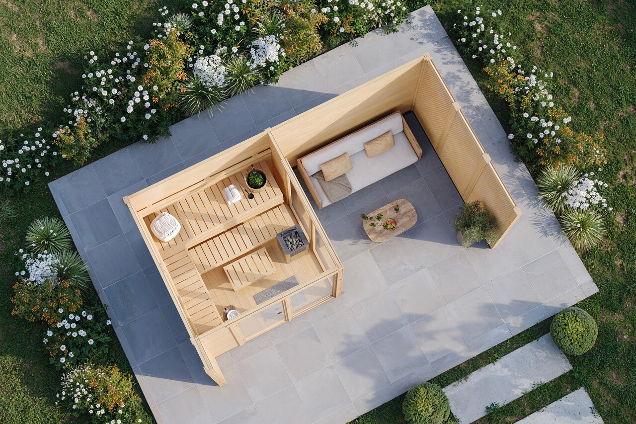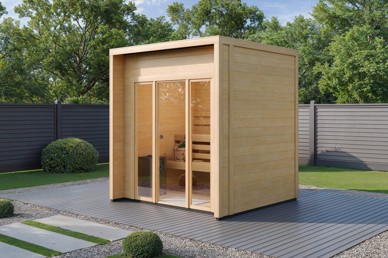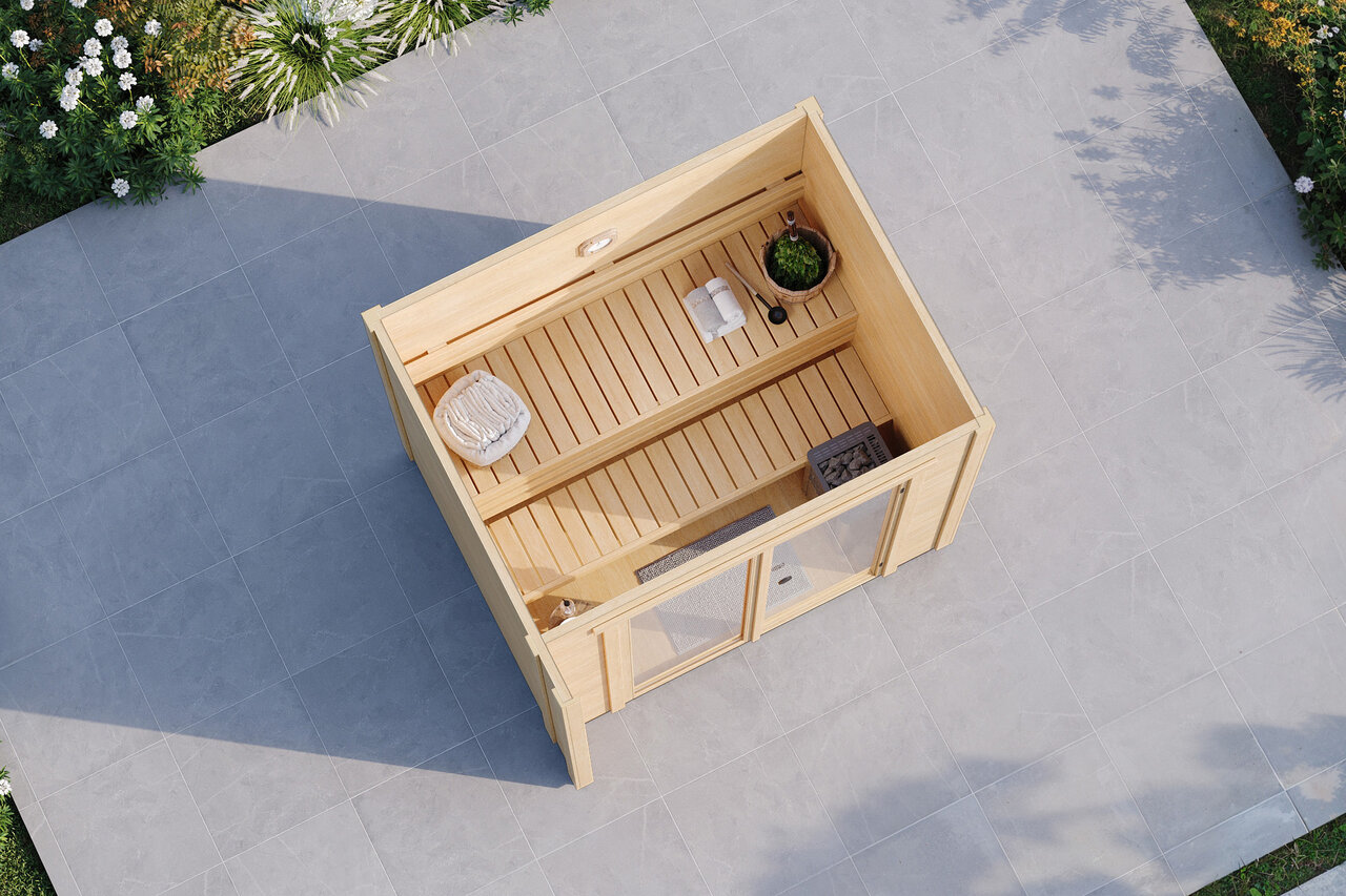 Entspannen Sie in Ihrem eigenen 4 m² Saunahaus mit großzügiger Vollglasfront. Modernes Design trifft auf gemütliches Wellness-Feeling – kompakt, stilvoll und ideal für ungestörte Auszeiten im Garten.