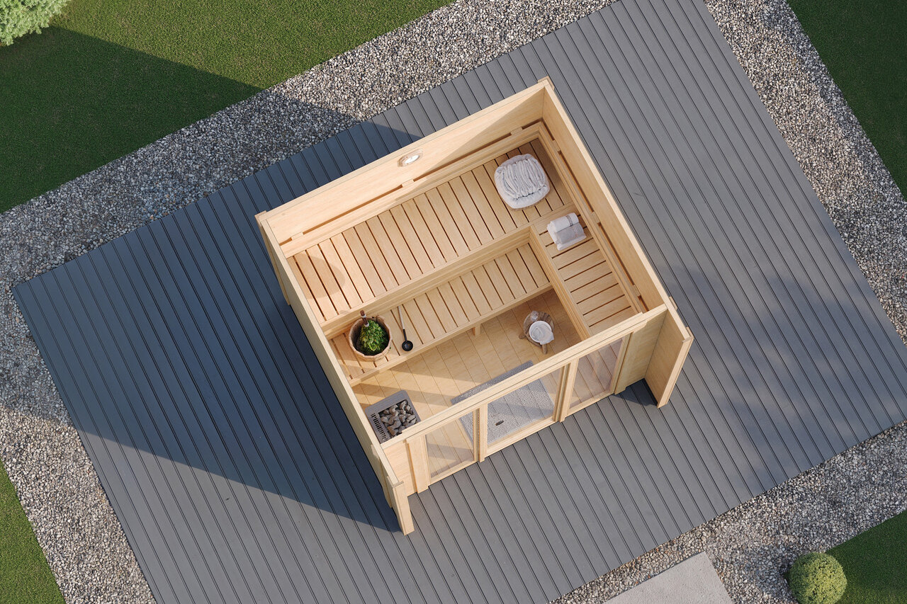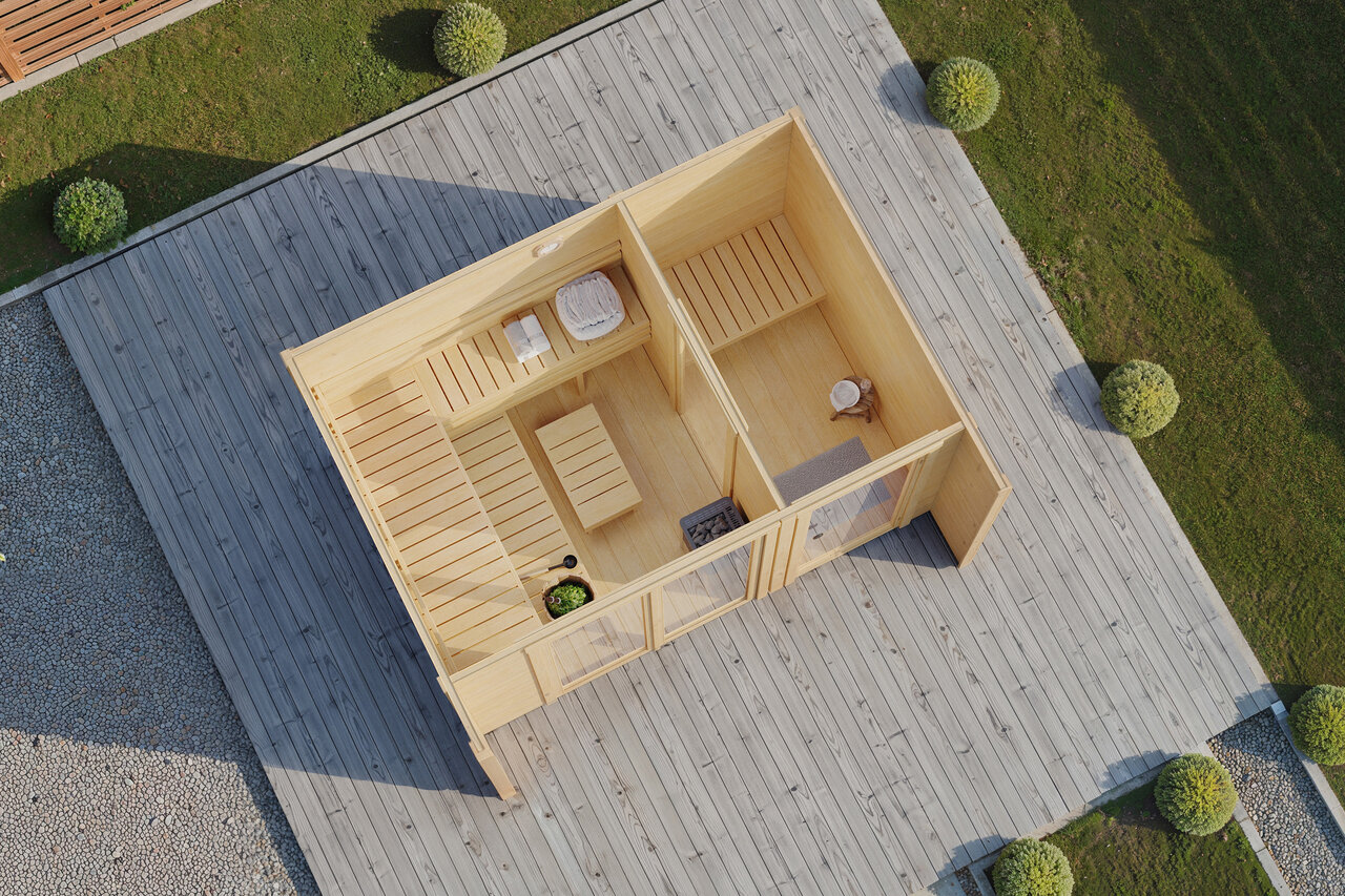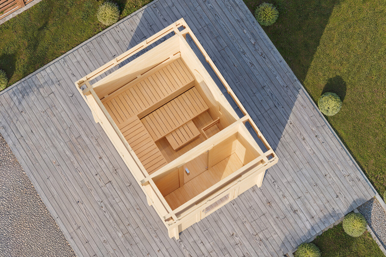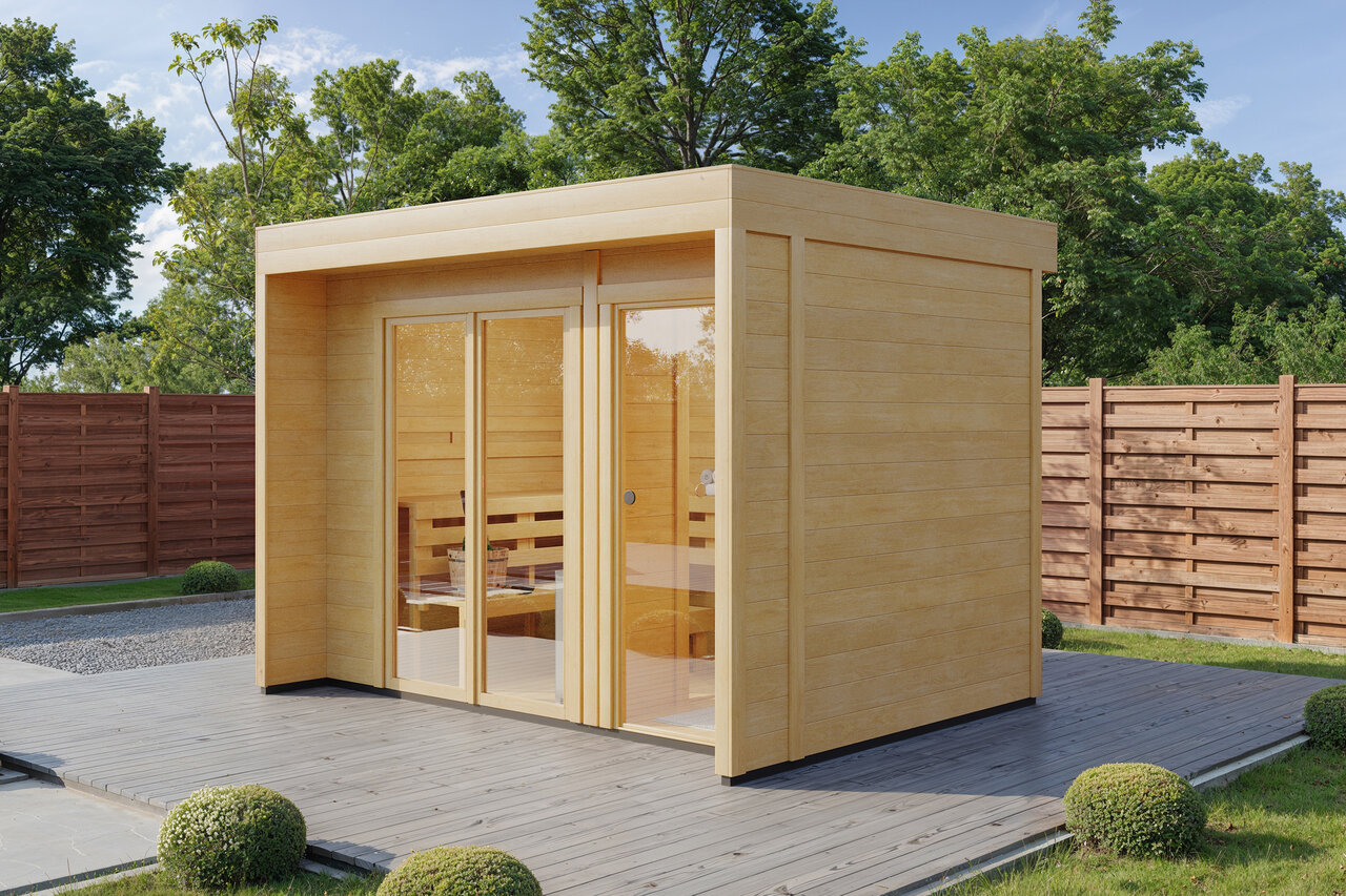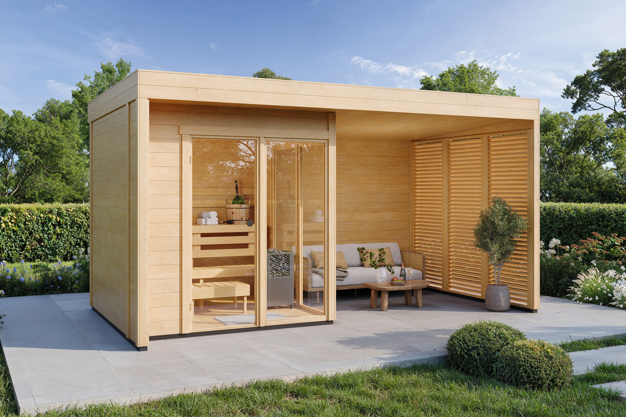 Wellness im Garten leicht gemacht: Das 3,8 m² Saunahaus mit großen Glaselementen, praktischem 3 m² Vorraum und ca. 6 m² überdachter Terrasse bietet Ihnen Entspannung, Komfort und moderne Optik in einem.
